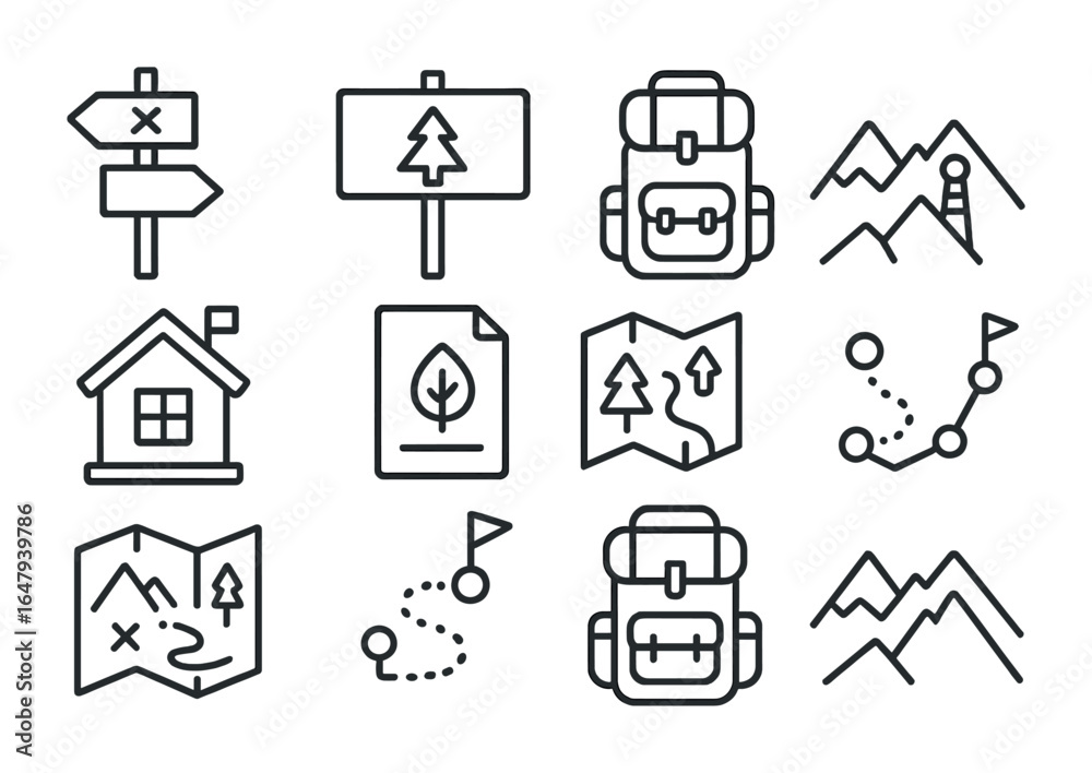 Hiking Icons Grid. Outline vector icons of cross-border hiking and eco-travel: trail marker, national park #1647939786
