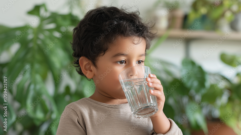 Hispanic child drinking glass of water in bright kitchen, Concept of healthy hydration #1759425707