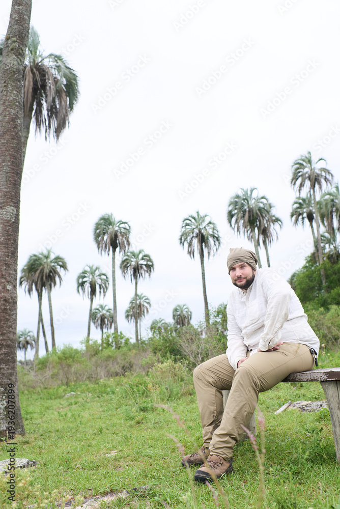 Hispanic young man looking at camera sitting on an outdoor bench surrounded by nature, hiker taking a break on the trail. The plants standing out in the background are butia yatay palm trees. #1936207899