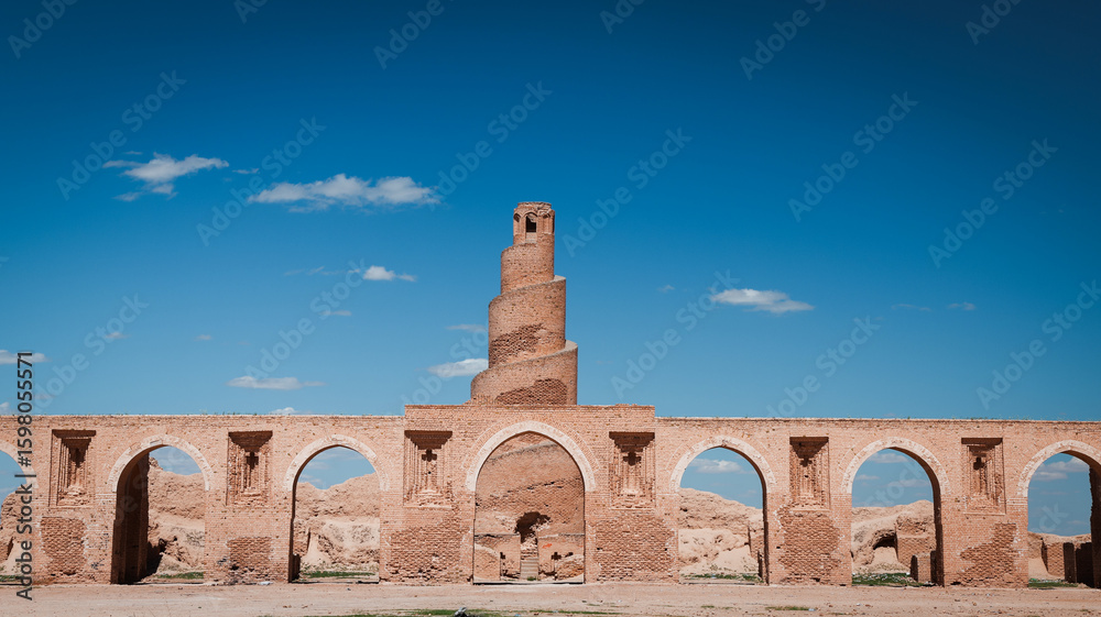 Historic architecture of Abu Dulaf showcases ancient ruins against a clear blue sky #1598055571