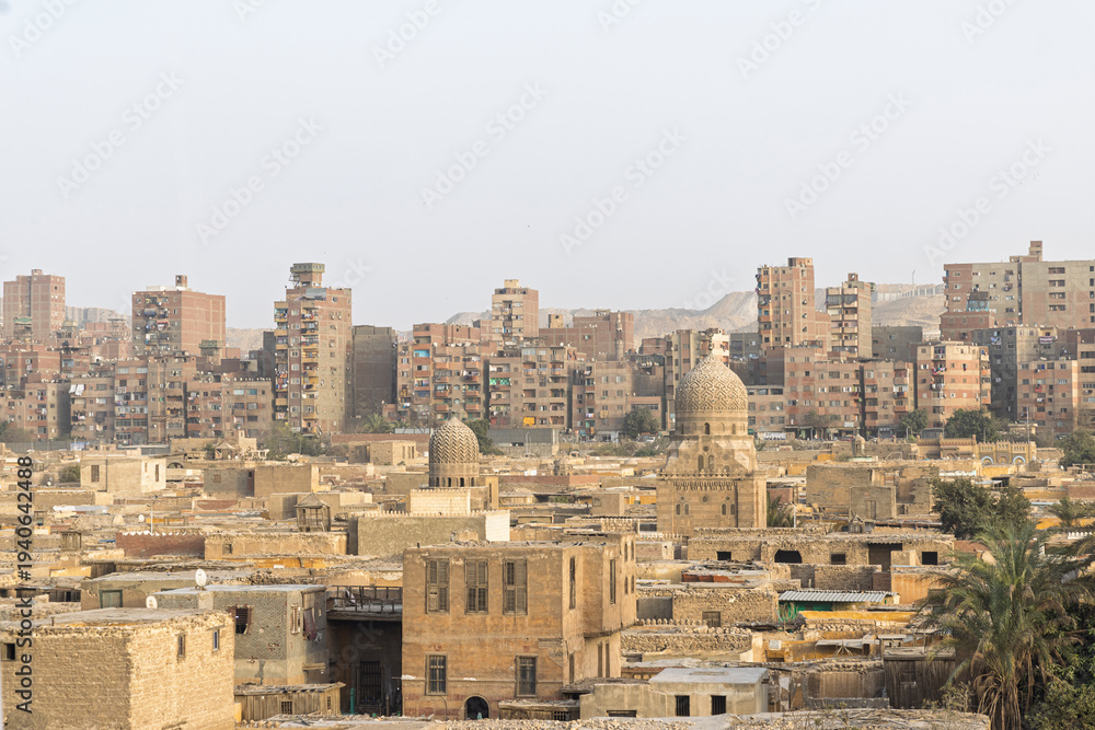 Historic Cairo cityscape with domed mausoleums and apartment blocks in Cairo, Egypt #1940642488