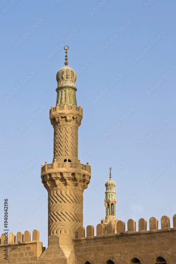 Historic spiral minaret of a mosque in Islamic Cairo, Egypt showcasing detailed stone architecture #1940642196