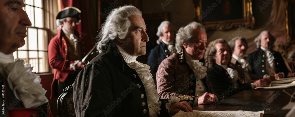 Historical reenactment of a late 18th-century gathering with men in colonial attire, possibly depicting a significant event or discussion. #873231108