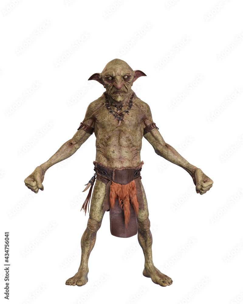 Hobgoblin standing with angry face and clenched fists. 3d illustration isolated on white background. #434756041