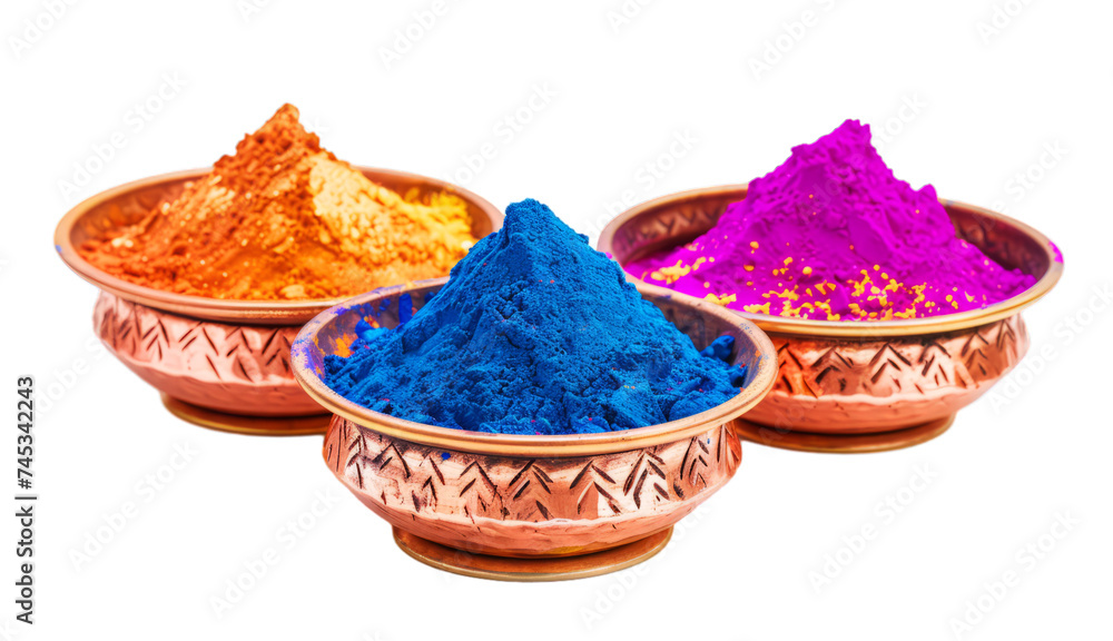 • #745342243 Holi powders in copper bowls. Colorful powder paint for indian spring of colors festival in pots. Isolated on background