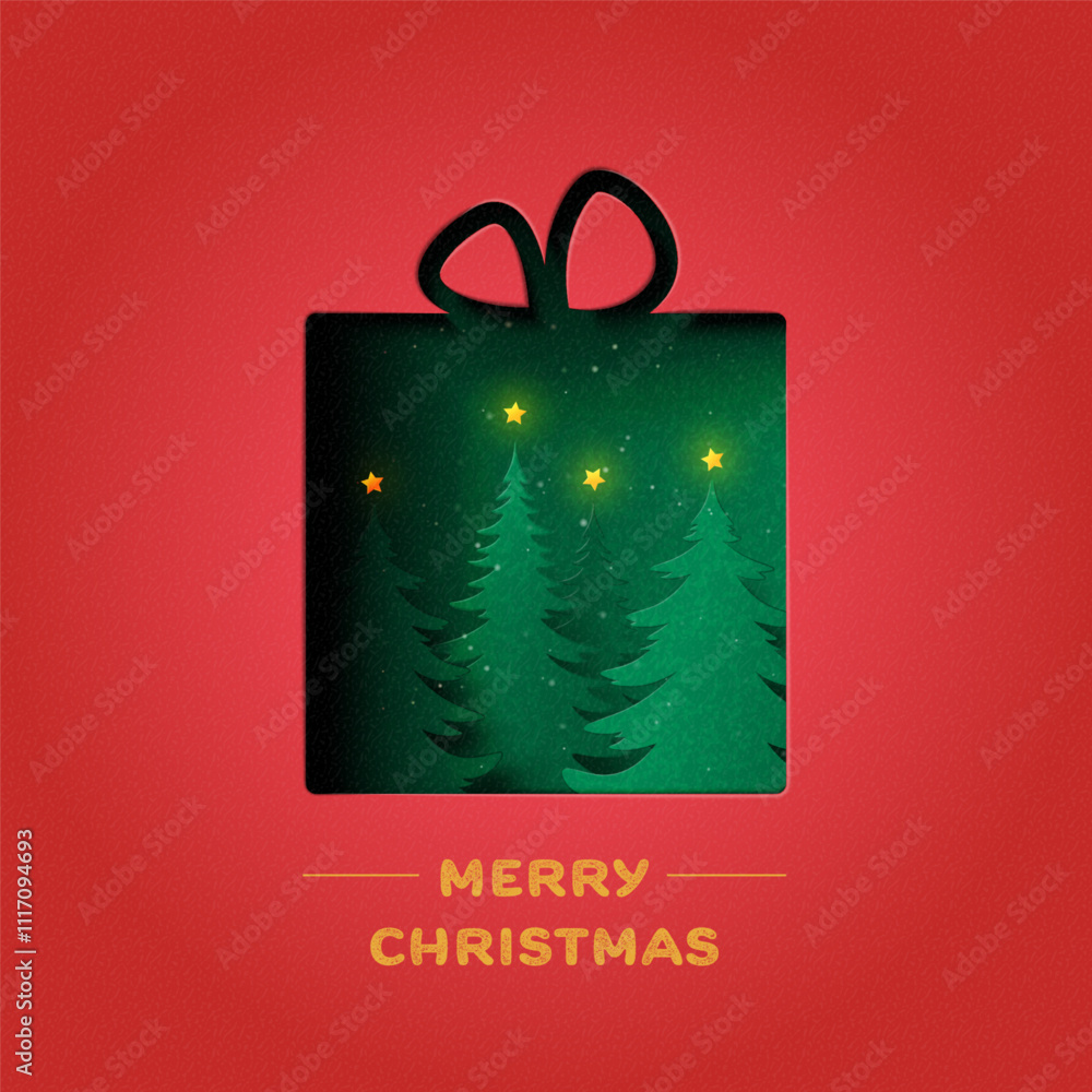 Holiday Christmas and winter season on red background. Gift Box decorated with Christmas Tree, Star and snowfall. Paper art vector illustration. #1117094693