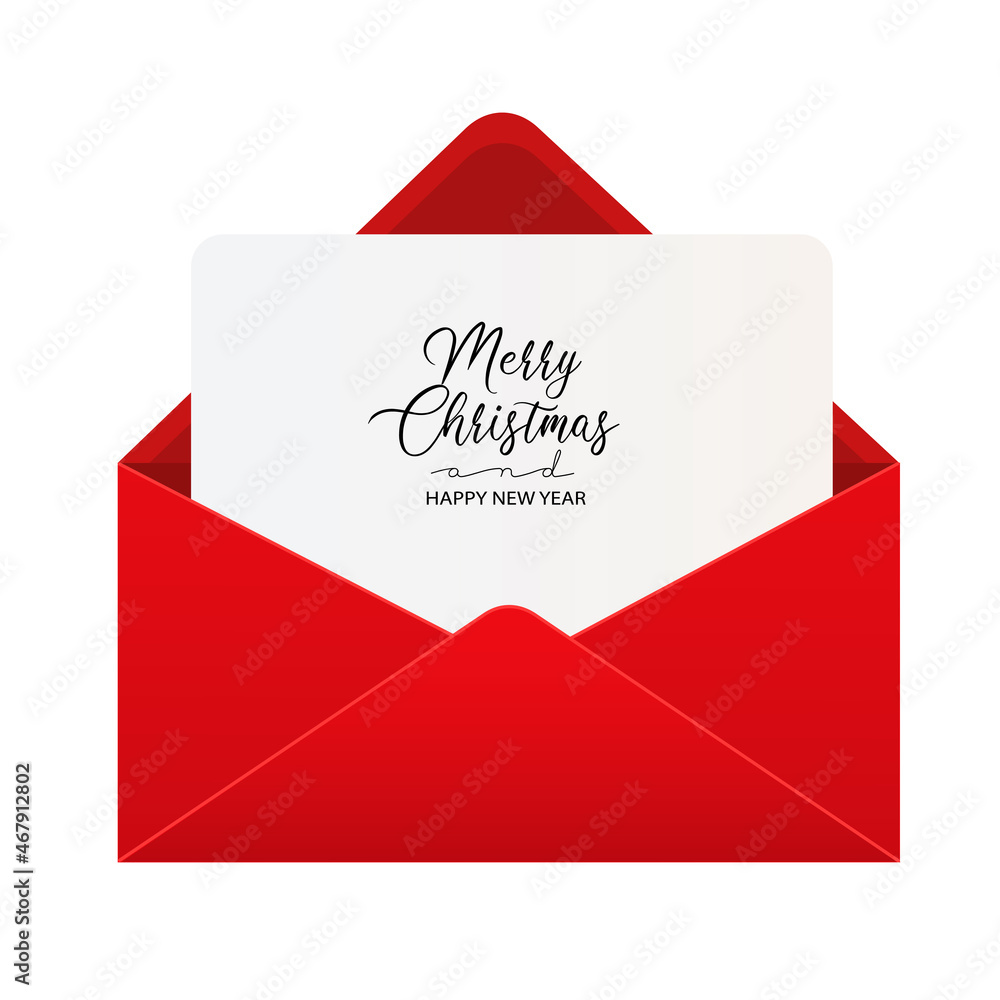 Holiday christmas greeting card in red open envelope. Vector illustration of xmas letter in envelope isolated on white #467912802