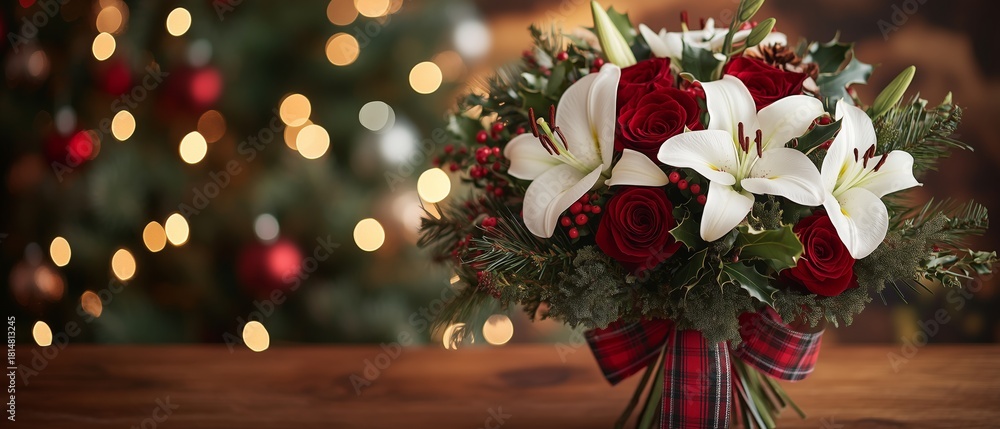 Holiday Floral Arrangement With White Lilies and Red Roses on a Wooden Table by Christmas Tree #1814813245