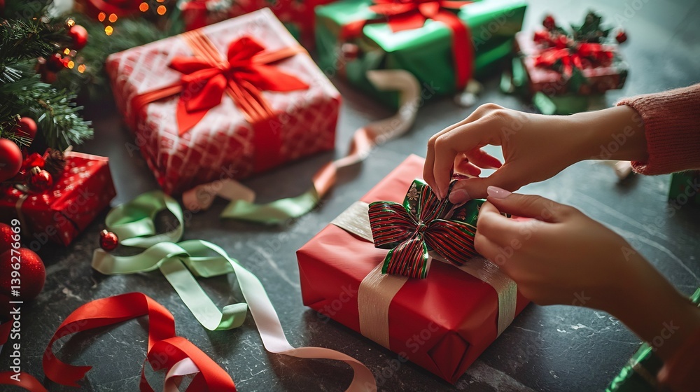 Holiday gift wrapping station a shopping mall ribbons and wrapping paper scattered on the table hands tying the perfect festive bow on a Christmas present #1396276669