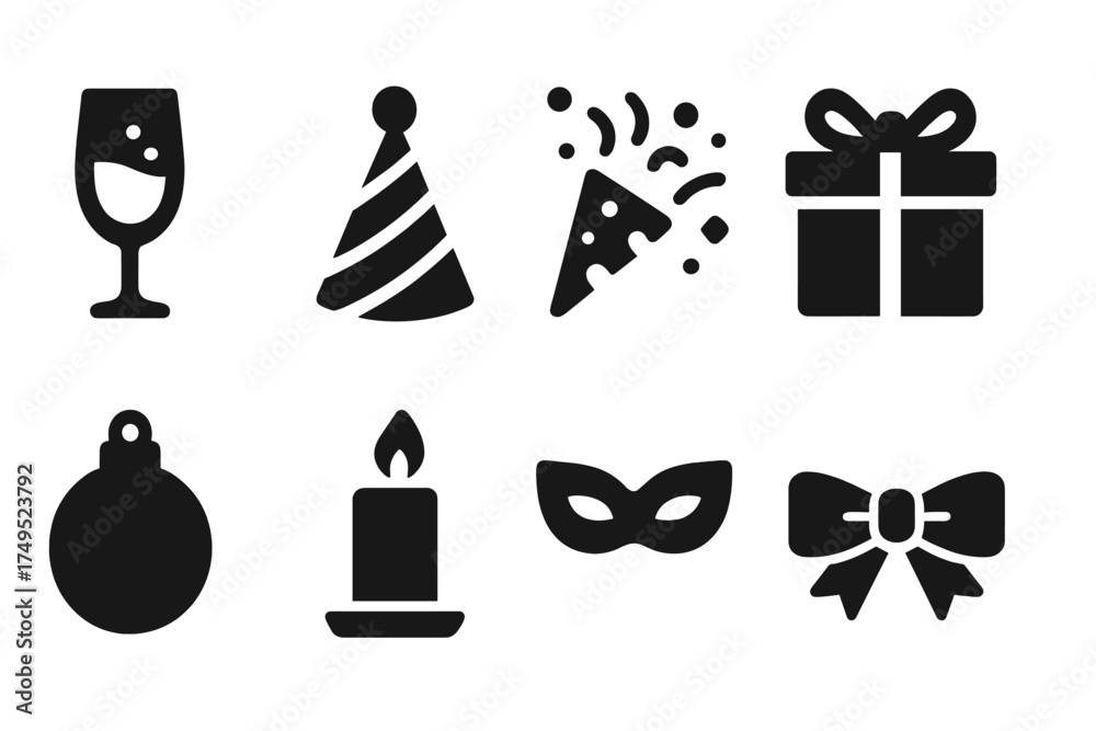 Holiday Icons Grid. Holiday Celebration. Filled icon set of Holiday Celebration: champagne glass, party hat, #1749523792