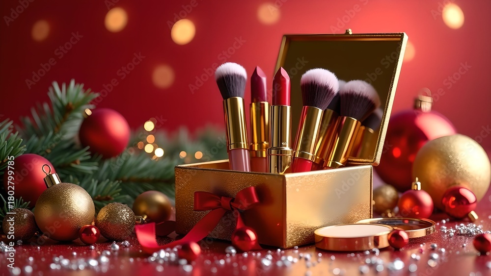 Holiday makeup set displayed elegantly with brushes and lipsticks against a festive backdrop #1802799785