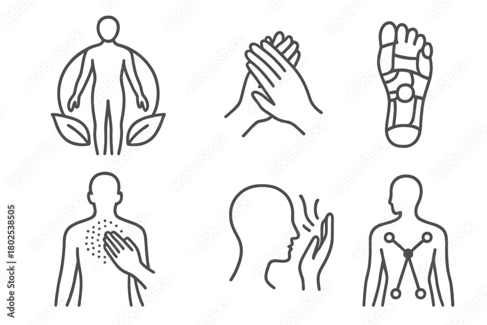 Holistic Healing Icons. Line style icons of holistic healing: holistic bodywork, massage hands icon, reflexology foot map, energy #1802538505