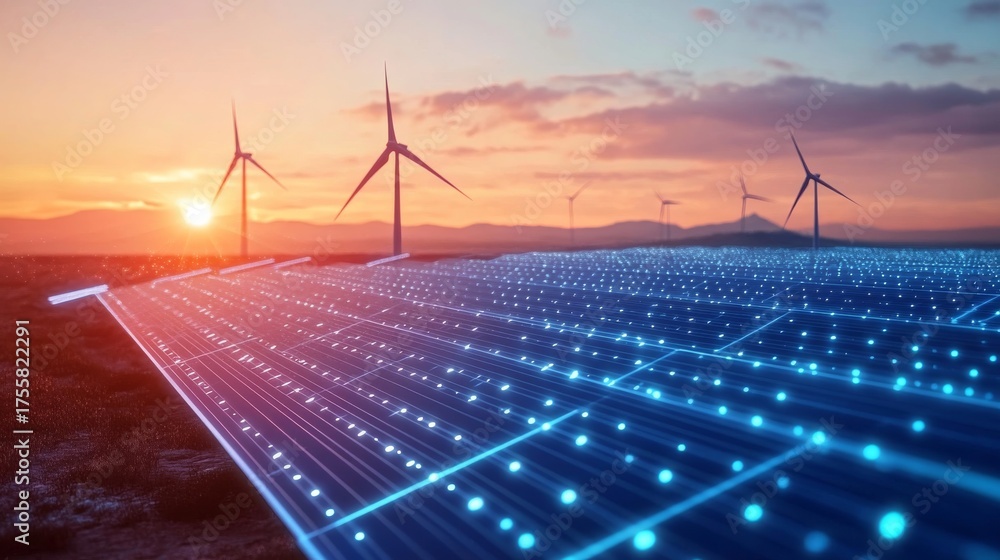 • #1755822291 Holographic clean energy concept featuring futuristic solar panels and wind turbines glowing with digital interfaces ultra-realistic bright background with extra space