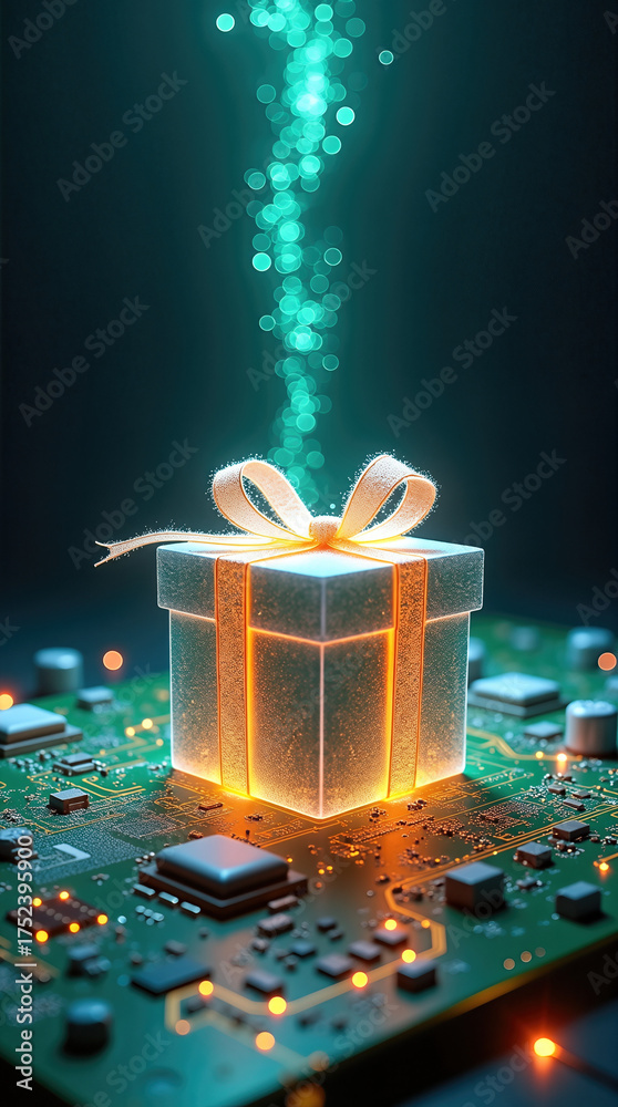 Holographic gift box on circuit board illuminated by glowing lights. Gift box radiates warmth with ribbon over intricate circuitry, symbolizing technology and creativity. #1752395900