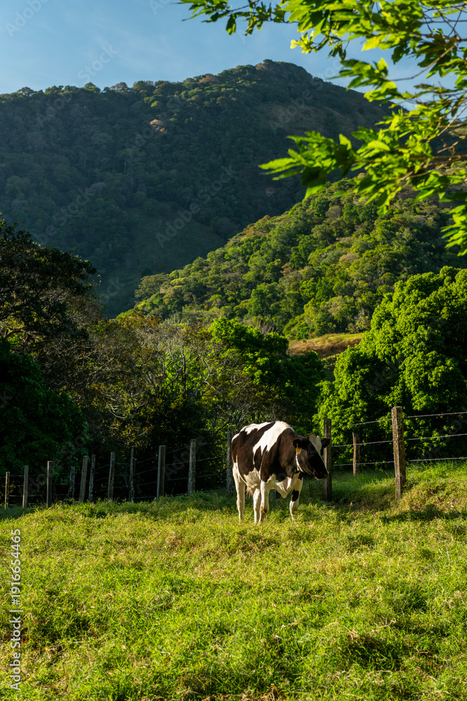Holstein dairy cows grazing freely on a lush green hillside pasture surrounded by tropical forest and mountain landscape. Natural livestock farming scene, Chiriqui, Panama - stock photo #1916654465