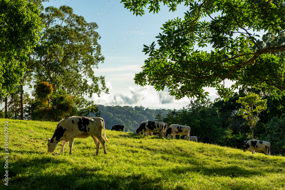 Holstein dairy cows grazing freely on a lush green hillside pasture surrounded by tropical forest and mountain landscape. Natural livestock farming scene, Chiriqui, Panama - stock photo #1916657922