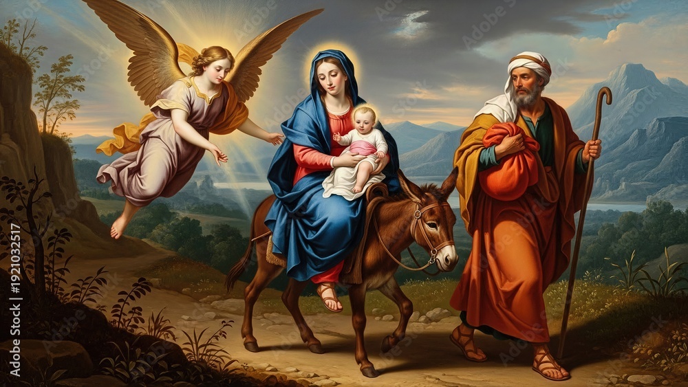 Holy Family's arduous flight, Virgin Mary with infant Jesus, Saint Joseph's guiding presence, divine angel protecting their exodus to Egypt through an ancient desert landscape #1921032517