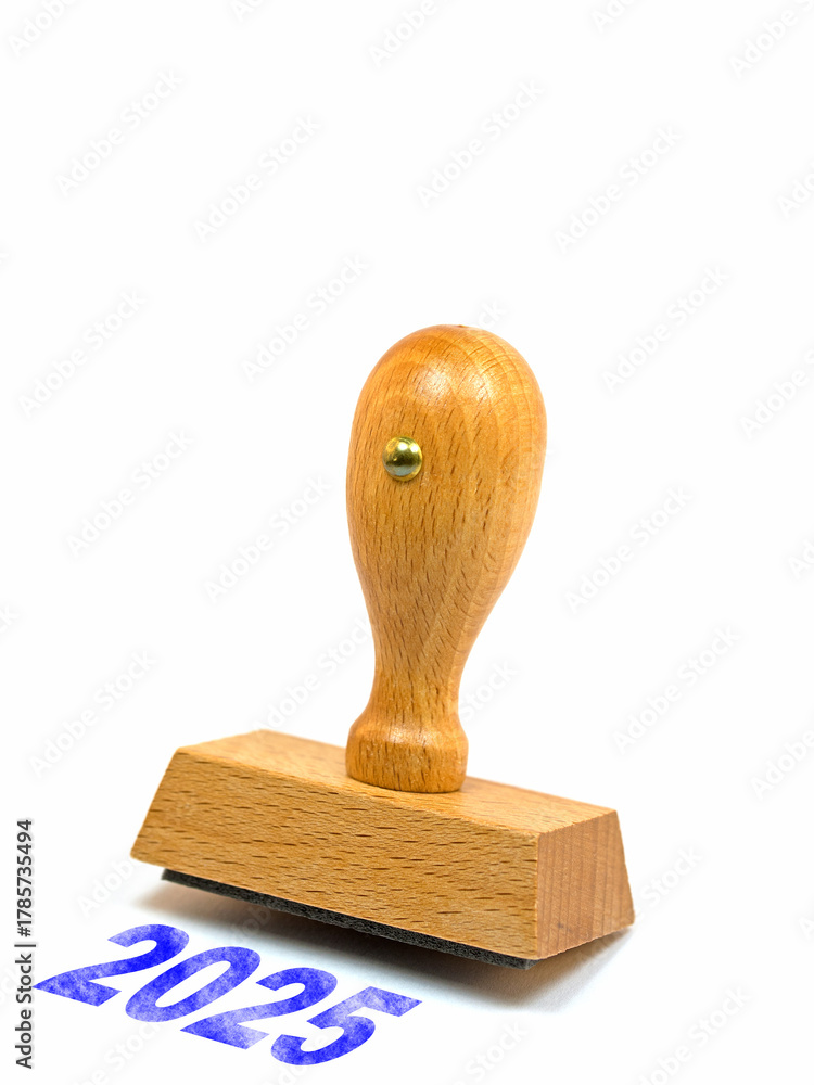 Holzstempel mit dem Aufdruck 2025 vor weißem Hintergrund #1785735494