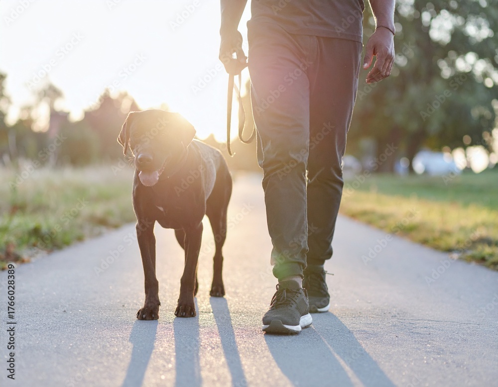 Hombre caminando con perro con correa en sendero de parque al amanecer, ropa deportiva casual, perro genérico de tamaño mediano #1766028389