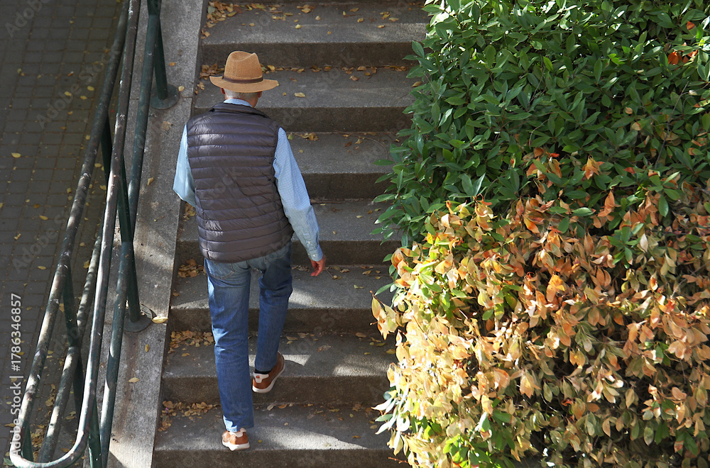 Hombre mayor con sombrero subiendo las escaleras junto a arbustos, matorral y planta de hoja verde, naranja y amarilla #1786346857