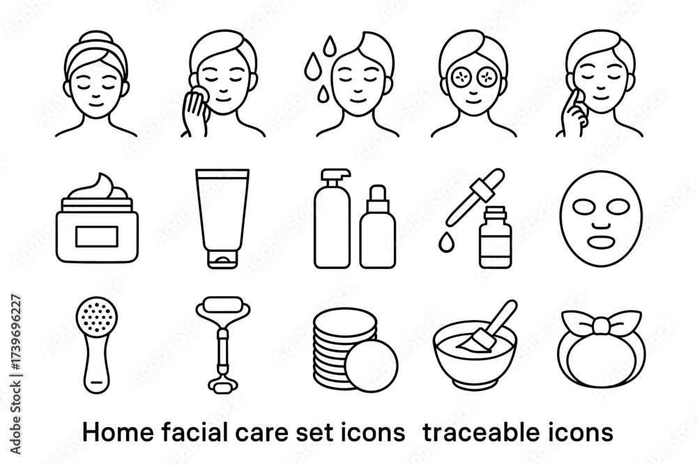 Home facial care icons set: outline symbols of skincare and beauty routine #1739696227