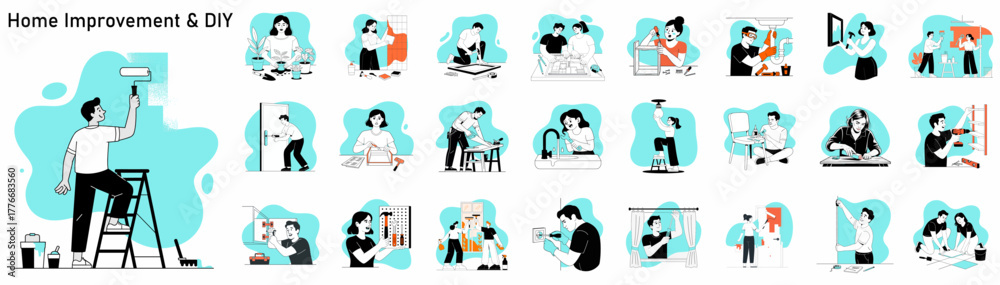 home improvement and diy illustration set with people painting, repairing and assembling furniture, vector collection for renovation and domestic lifestyle concepts #1776683560