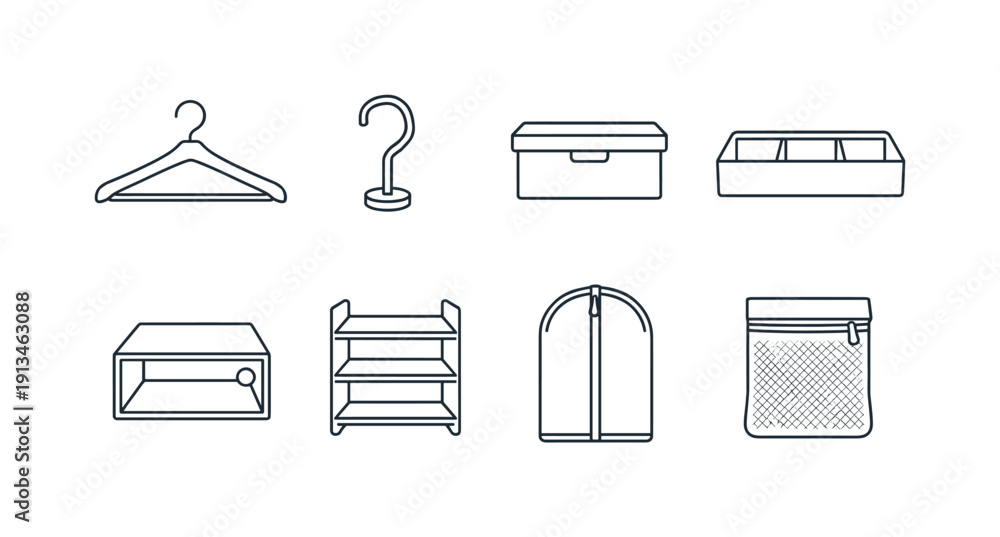 Home wardrobe accessories: clothes hanger, hanger hook, storage box, drawer divider, shoe box, shelf organizer, garment cover, laundry bag. #1913463088