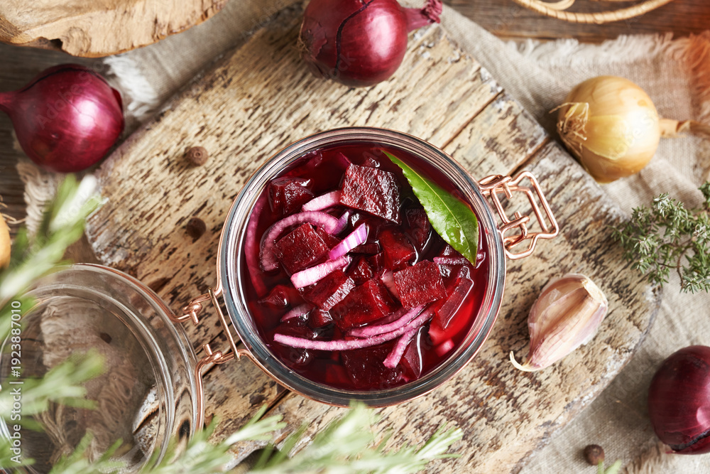 Homemade beet root kvass in a glass jar with garlic, onion and bay leaf #1923887010