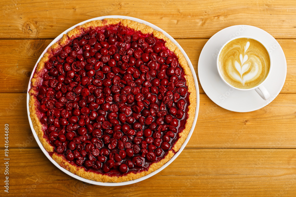 Homemade berry pie with cherry and cup of coffee cappuccino on wooden table. Top view. #1941644680