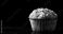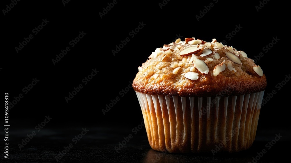 Homemade coconut cinnamon muffin adorned with almond flakes, beautifully showcased against a black background with ample copy space for healthy food promotion. #1093418310