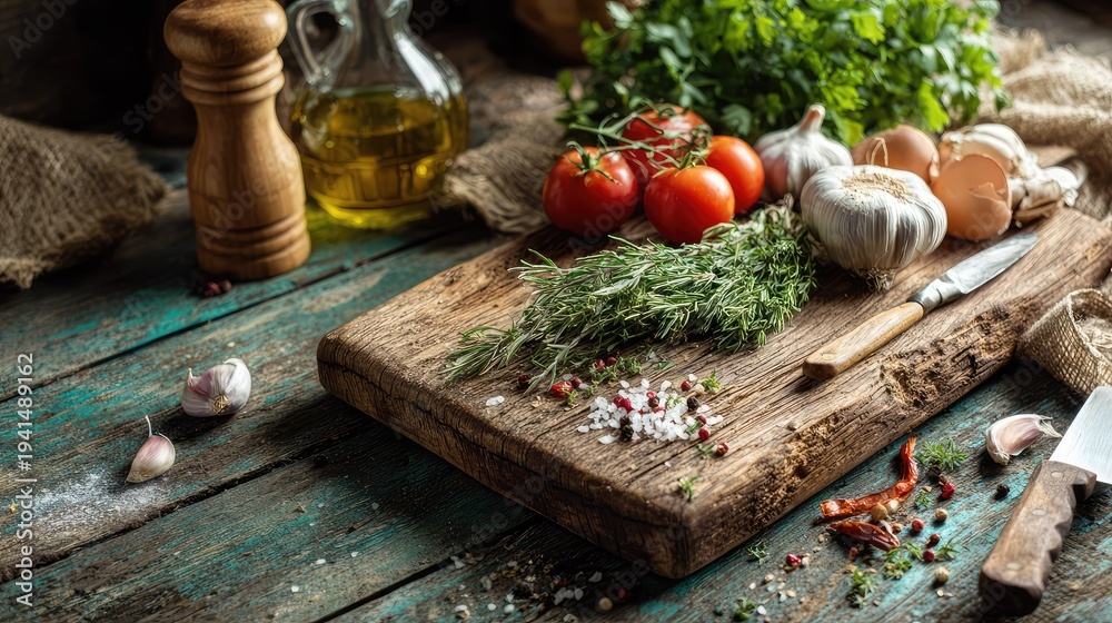 Homemade cooking scene with fresh ingredients cutting board and kitchen utensils on rustic table #1941489162