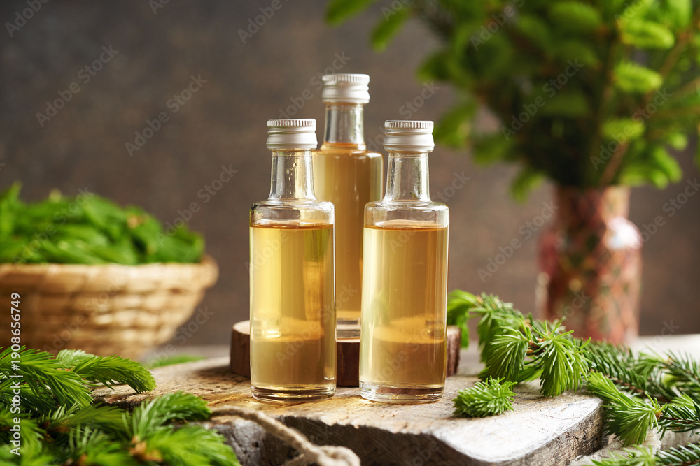Homemade herbal syrup made with young raw spruce tips collected in spring and brown sugar #1908656749