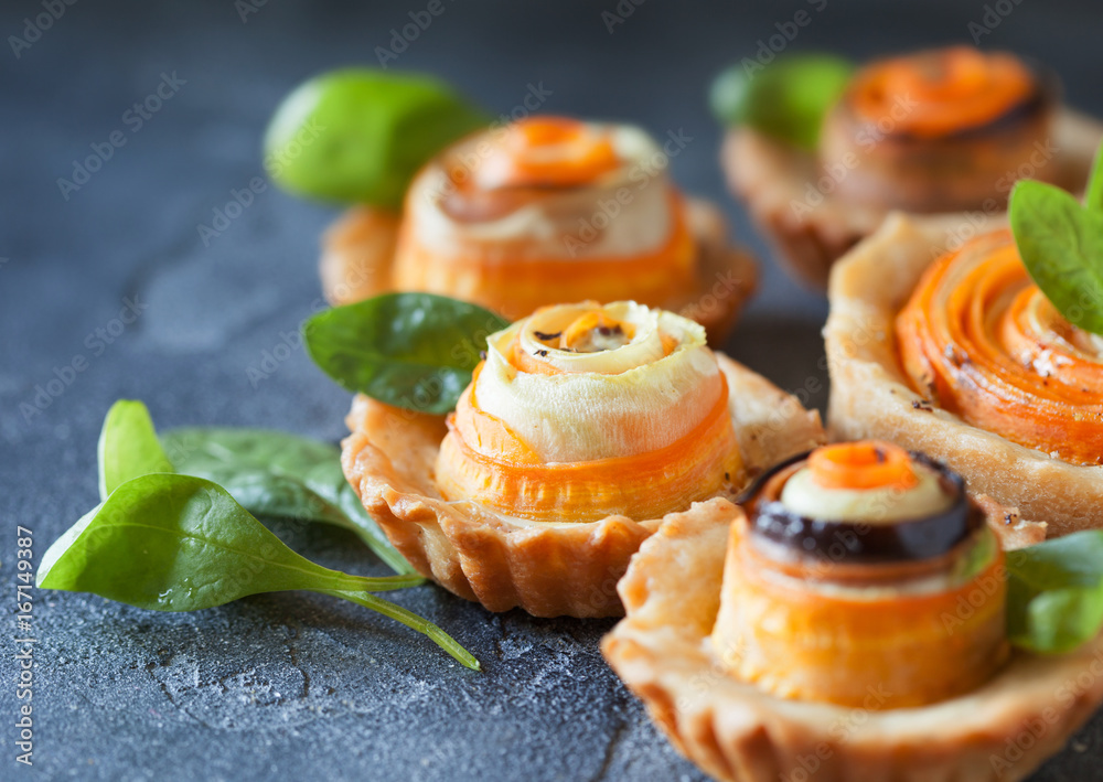 Homemade quiche tart with carrot, eggplant and cabbage roulade with soft cheese #167149387