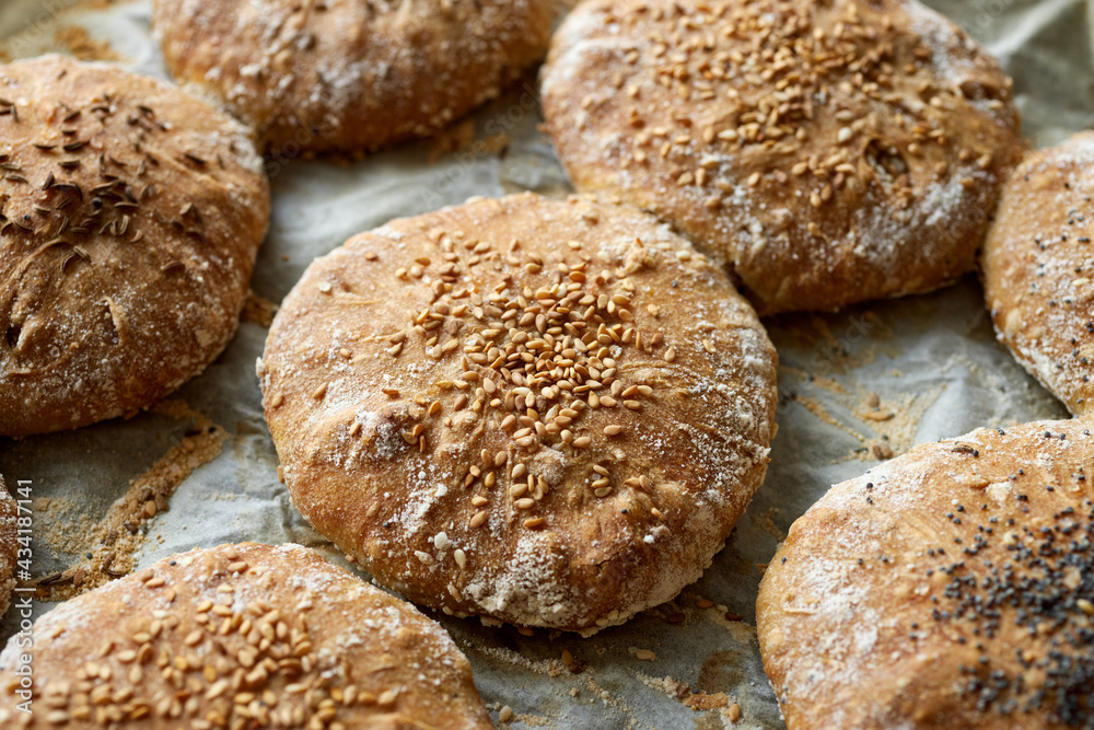 Homemade spelled flour bread with the addition of various seeds such as sesame, poppy seeds, caraway, close up view #434187141