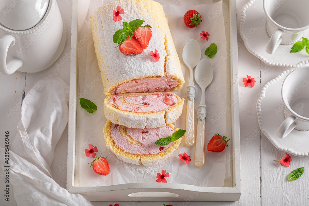 Homemade strawberry roulade with powdered sugar and berry fruits. #639546946