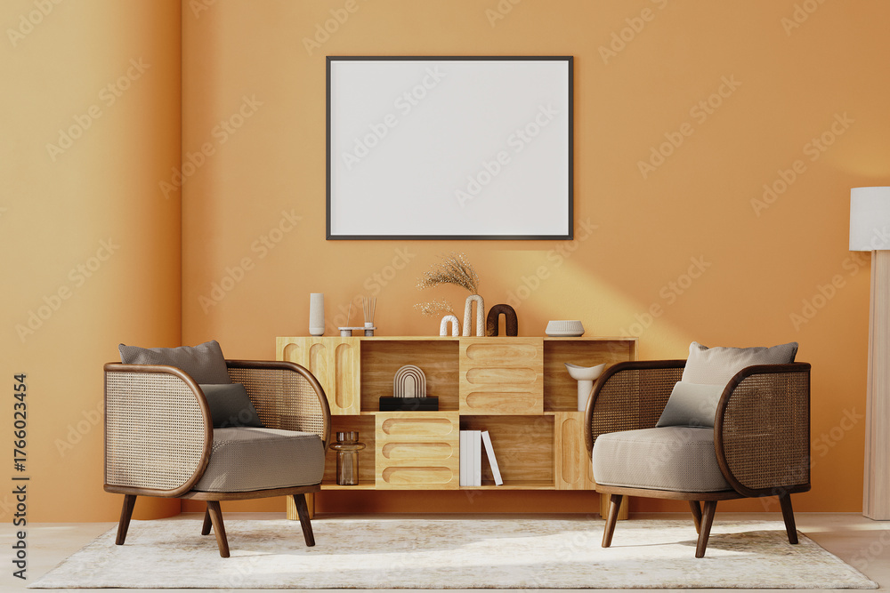 horizontal frame mock-up in bright orange wall interior, living room with armchairs and cabinets, wall mock-up, 3d render #1766023454