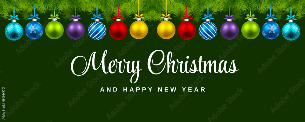 Horizontal new year background, christmas banner with the inscription Merry Christmas and Happy New Year on a green background with a decorative frame of fir branches and christmas balls. #1809569701