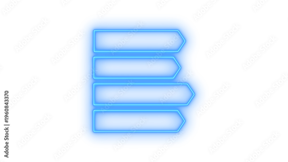 Horizontal set of four glowing blue neon arrow-shaped empty text boxes for user interface design, information display, or infographic elements, isolated on transparent background. #1960843370