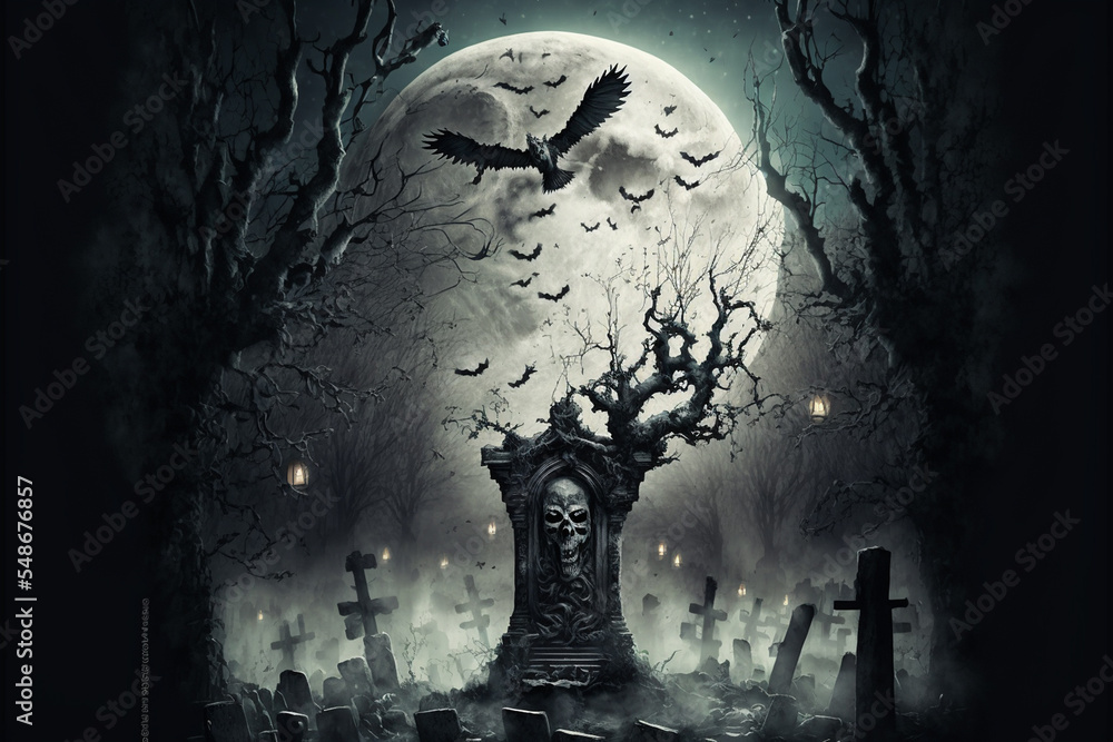 Horror cemetery at night with full moon and ravens. Digital art #548676857