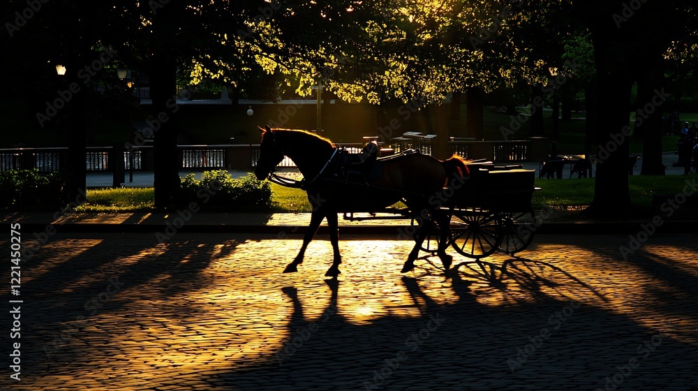 Horse drawn carriage silhouetted at sunset with golden light and long shadows #1221450275