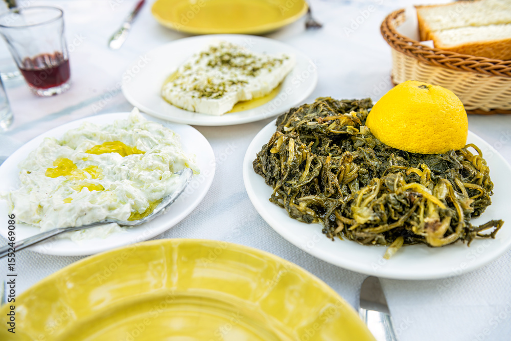 Horta wild greens, tzatziki olive oil, feta kathoura Ikarian cheese food at restaurant on Ikaria island, Greece longevity blue zone diet #1552469086