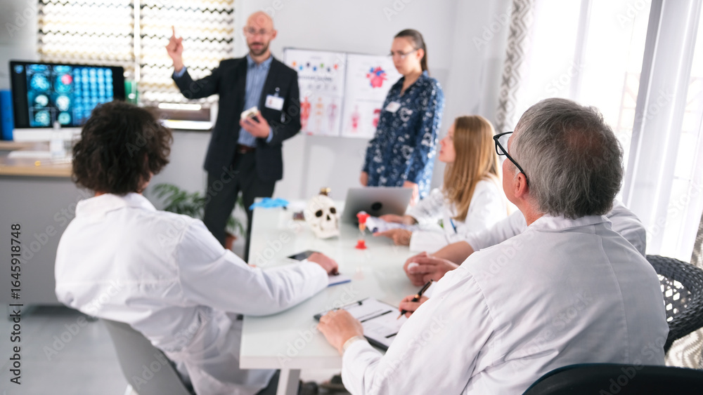 Hospital staff at the presentation of a groundbreaking brain surgery. A group of scientists in white lab coats are sitting at a table #1645918748