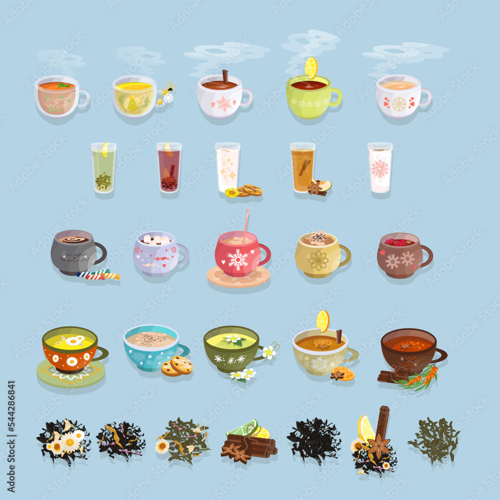 Hot drinks set. Collection of coffee, tea, grog, ouch, hot chocolate in cups with winter ornament. Restaurant, café menu items. Flat vector illustration. #544286841