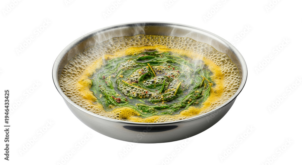 Hot nutritious green vegetables bubbling in a savory golden soup base with rising vapor #1946433425