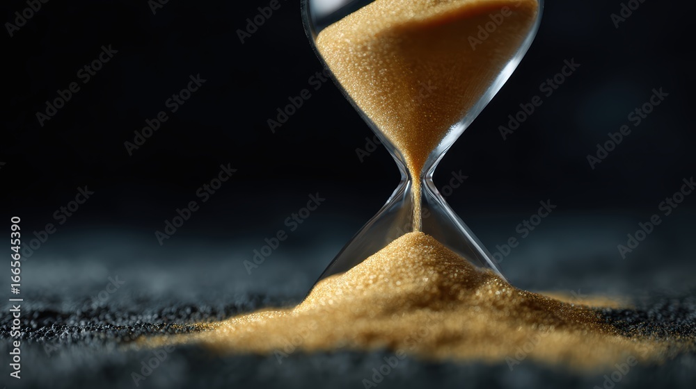 Hourglass with golden sand slowly flowing, dark background with soft spotlight, symbolic of passing time #1665645390
