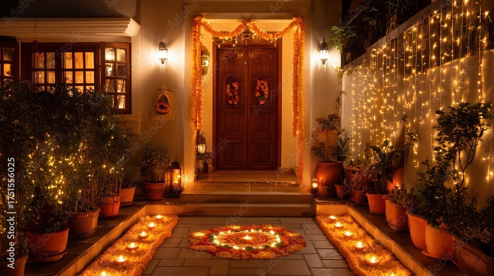 House decorated with diyas and marigold garlands for Diwali celebration #1751556025