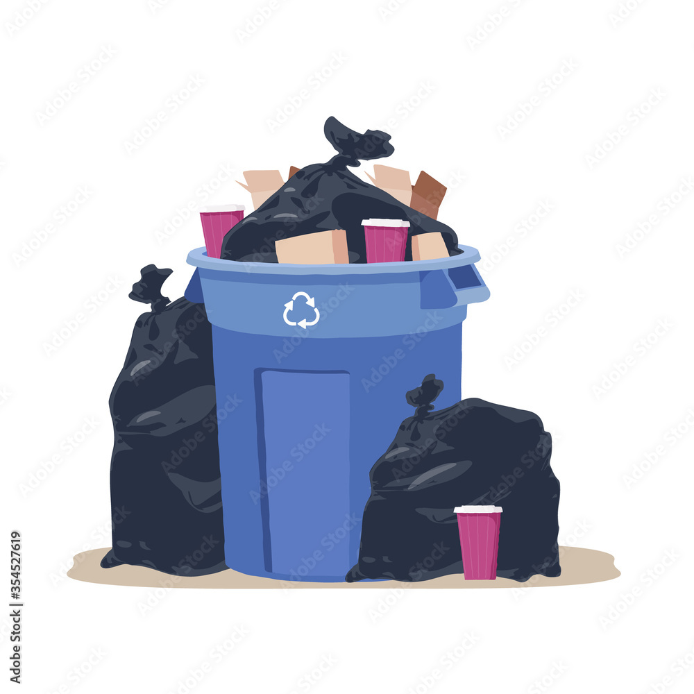 House trash bin. Cardboard box. Heap of rubbish. Garbage bag. Container. #354527619