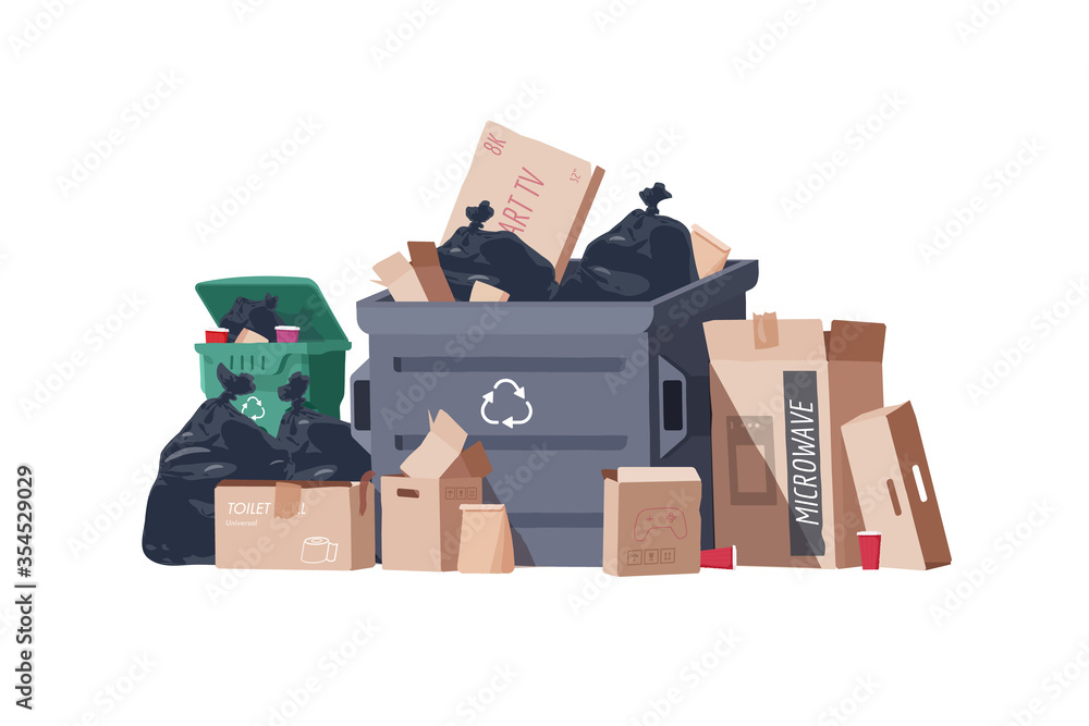House trash bin. Cardboard box. Heap of rubbish. Garbage bag. Container. #354529029