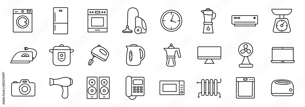 Household appliances. Home appliances and electronics icons. Vector illustration. #603376997