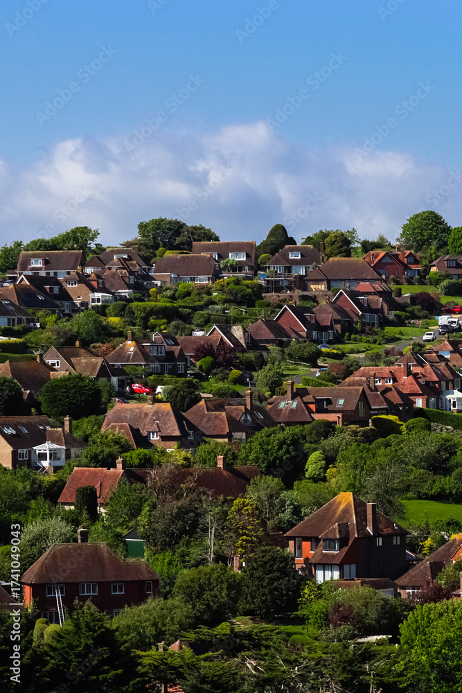 Houses and lush green trees cover a sunny suburban hillside under a blue sky. East Sussex countryside, England #1741049043